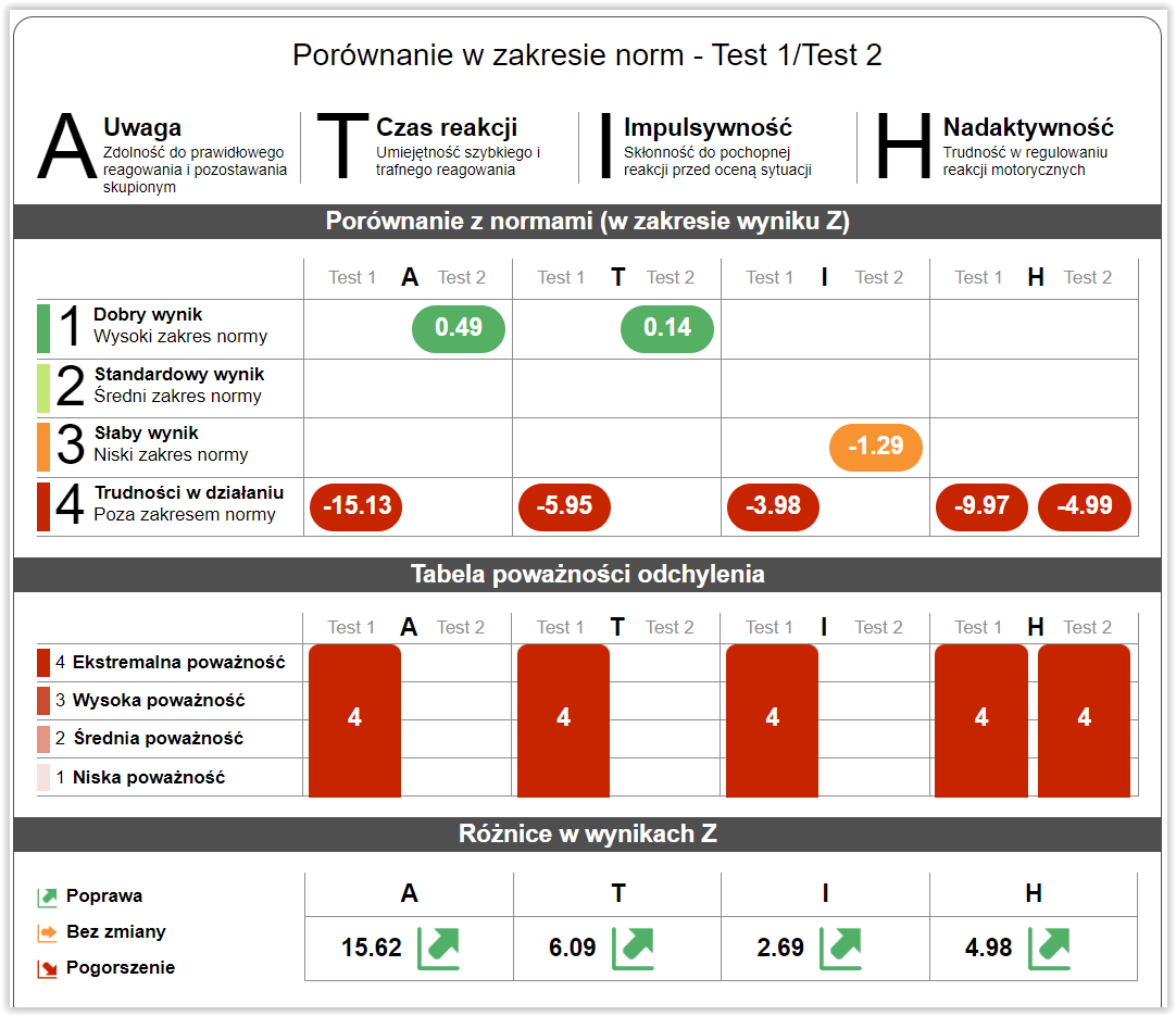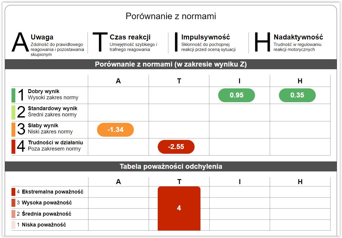 Wynik badanego w zakresie mierzonych wskaźników (uwaga, czas reakcji, impulsywność i nadaktywność) zostaje porównany z grupą normatywną (normy międzynarodowe zostały zebrane dla wieku oraz płci) i zaprezentowany na jednym z czterech poziomów. Dla wskaźników odchylonych od normy prezentowana jest również skala poważności odchylenia.