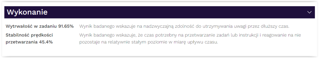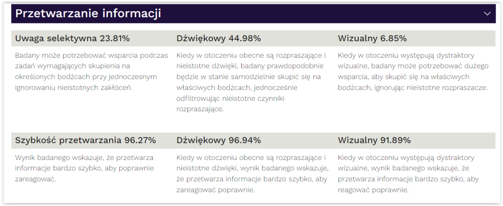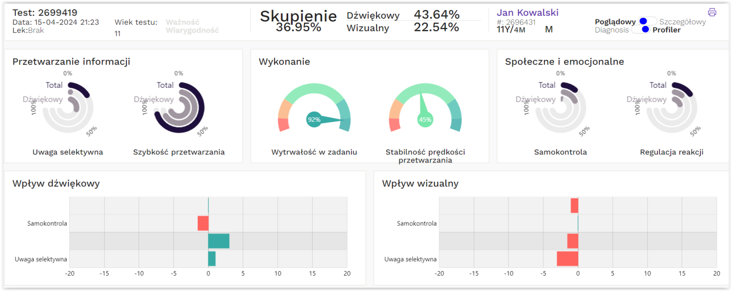 Ocenę wyników w całym spektrum uwagi. Opierając się o tzw. populację ogólną, której bazą jest ponad 58 000 wyników testów, jesteśmy w stanie wygenerować szczegółowe profile, podkreślając mocne stron, a także obszary wymagające poprawy.